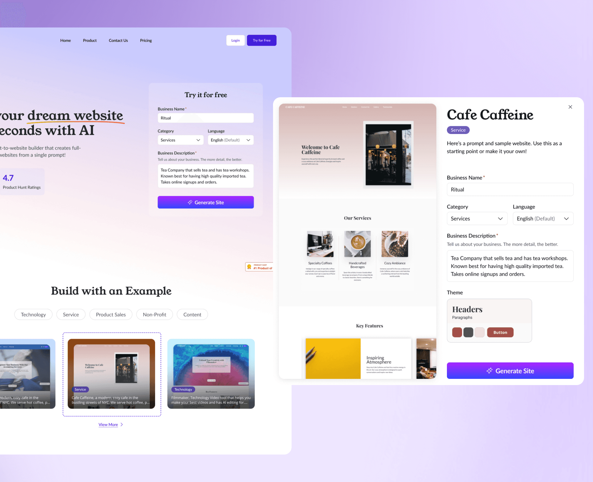 I added example sites to Butternut’s landing page with editable prompts. This accomplished two things: it showed users the range of what Butternut could create, and clarified the type of prompt that produces good results.