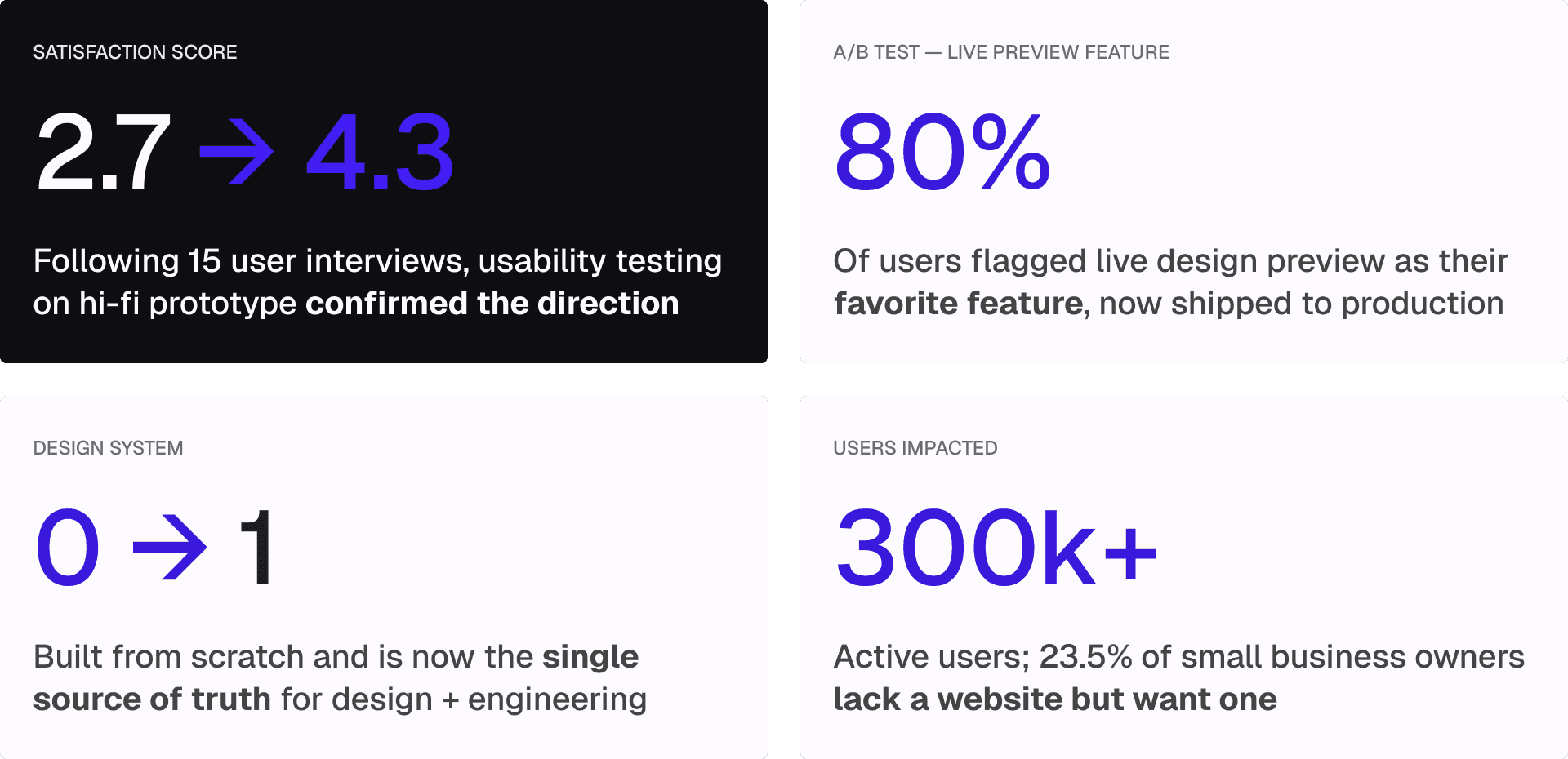 Redesigning the AI editor for a website builder used by 300k+ users, turning a 2.7 into a 4.3 satisfaction score, a 59% lift.