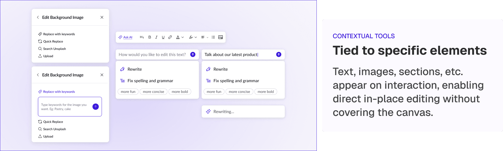 Editing tools appeared as popups that blocked the canvas, making it impossible to see changes in context as they made them.