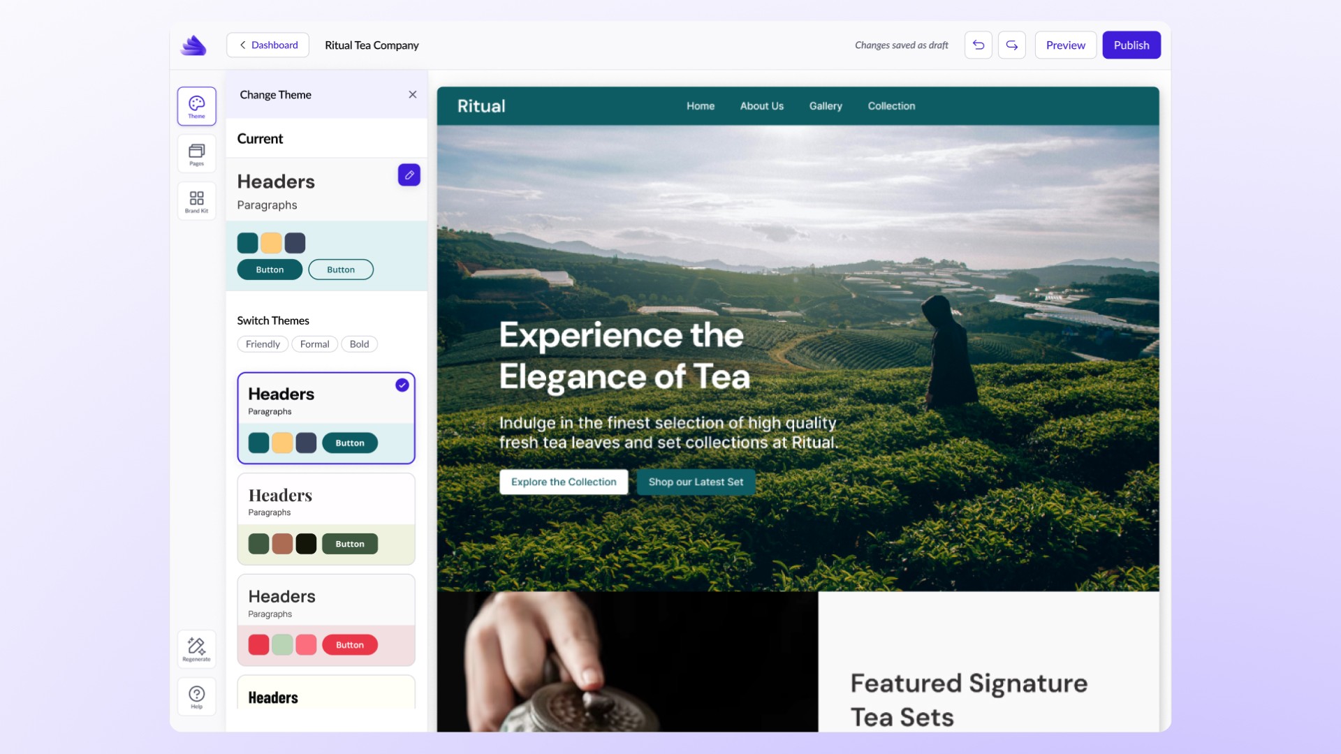 The top bar was redesigned to handle site management and navigation, including accessing the home dashboard, switching projects, and publishing the site.