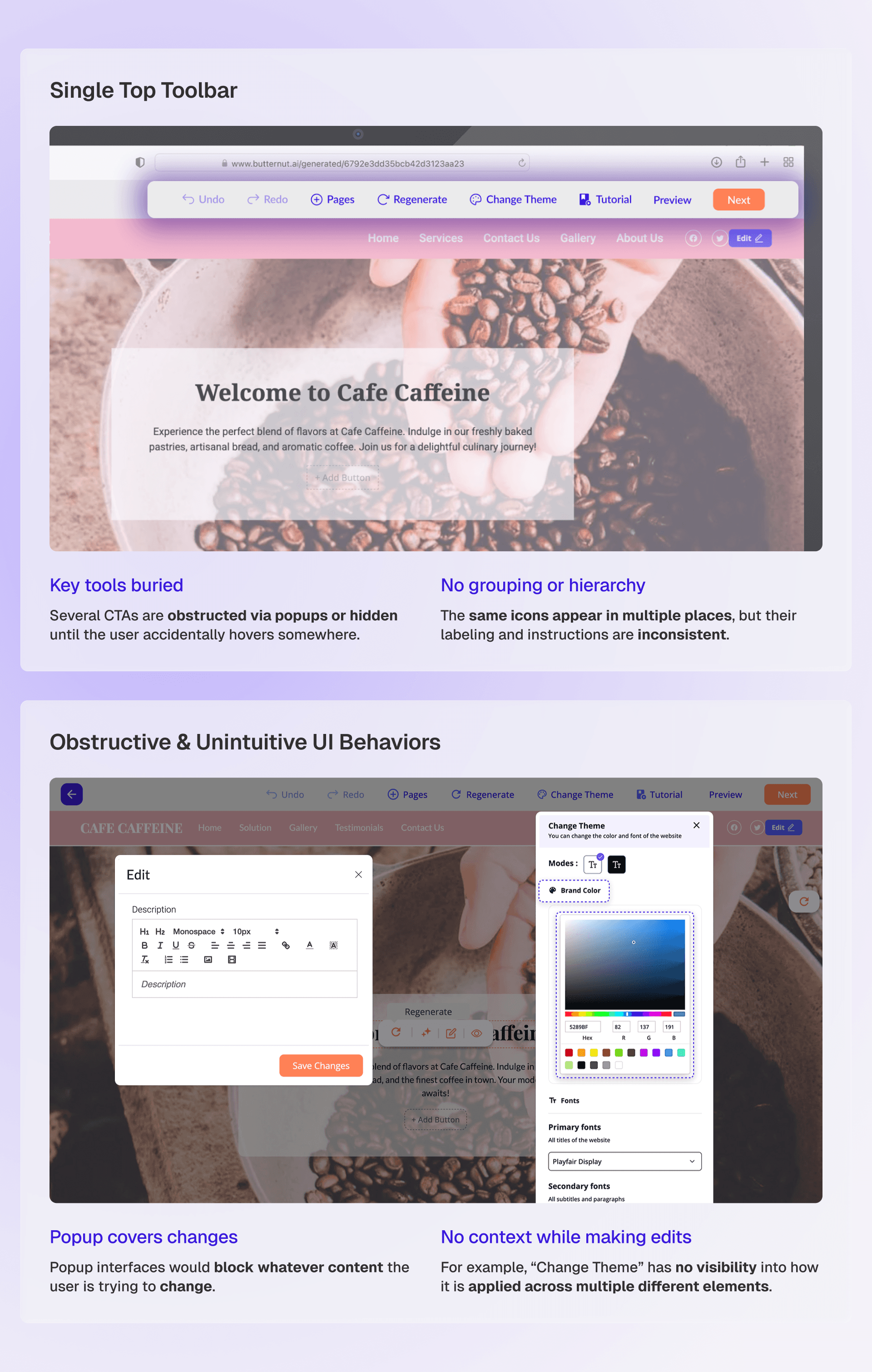 The original editor had a single top toolbar whose actions changed depending on what was clicked — without any visual indication that this was happening. Other tools appeared as pop-ups, covering the canvas during editing.